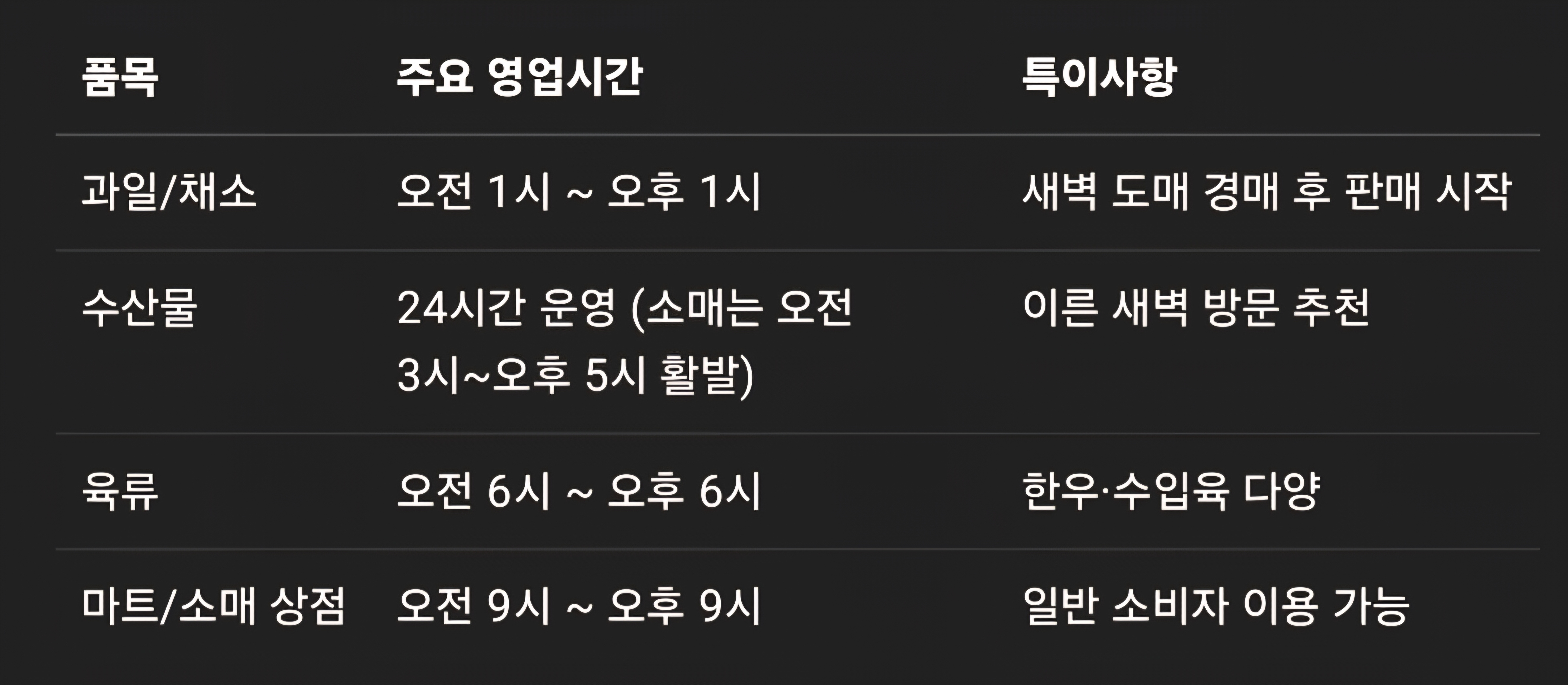 ※ 새벽 시간은 상인, 식당 납품업자 중심이고, 오전 6~10시 사이가 일반인 방문 적기입니다.