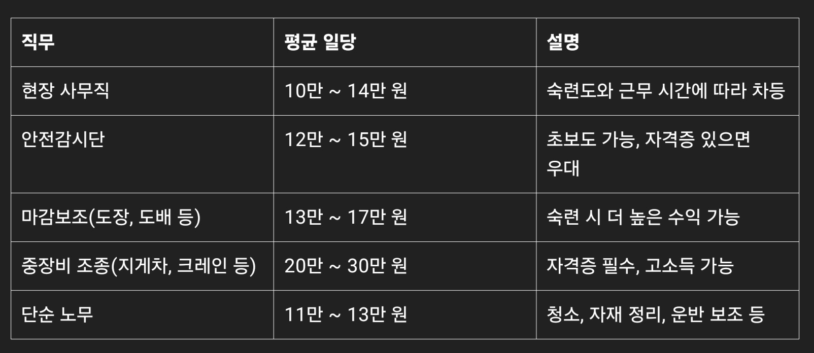 참고: 건설현장은 대체로 주 6일 근무를 기준으로 하며, 주휴수당은 별도입니다. 또한, 비숙련 여성 노동자의 경우 초반에는 약간 낮은 급여를 받을 수 있지만, 숙련도가 올라가면서 임금 상승 여지가 큽니다.