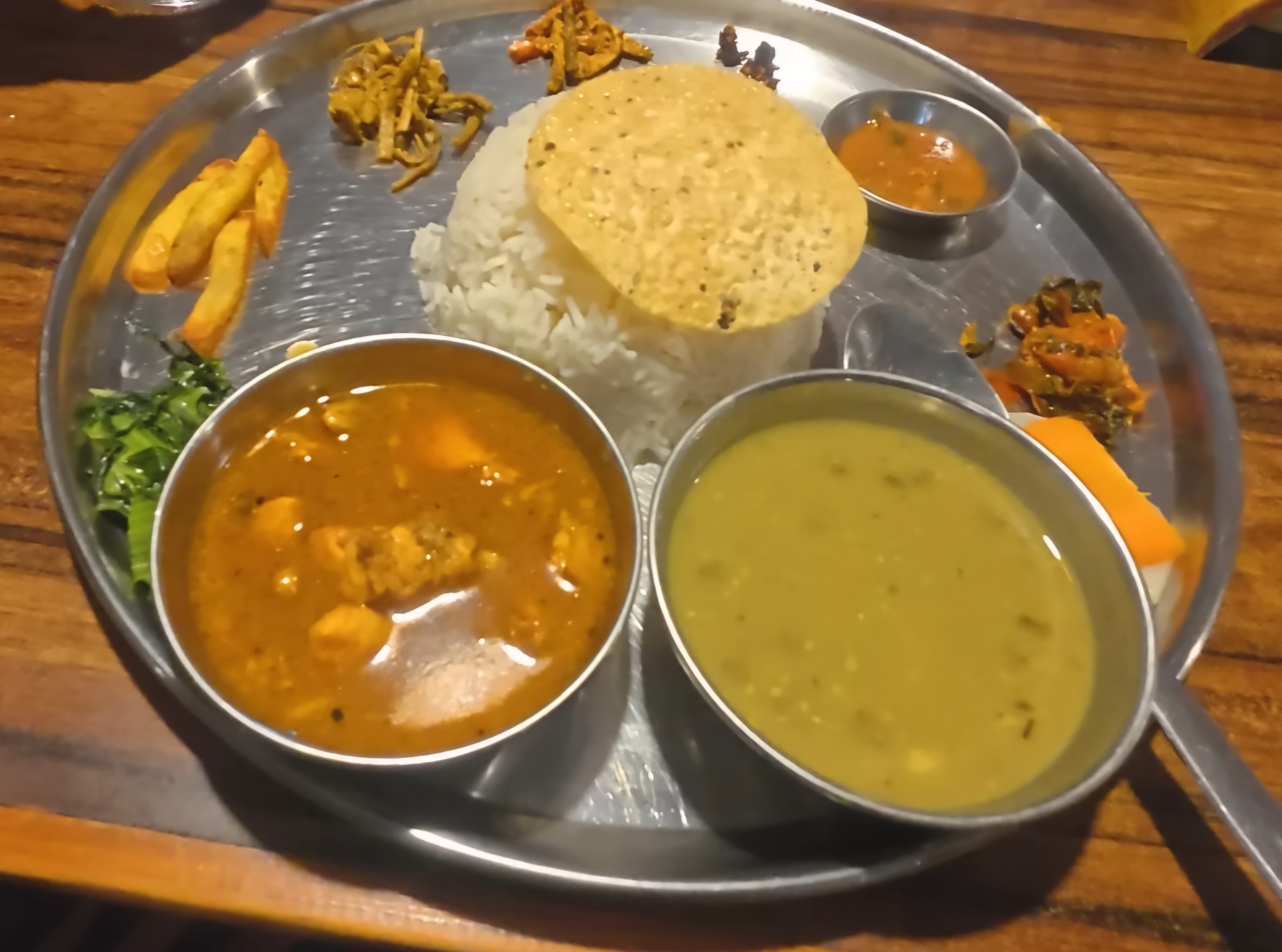 네팔 대표 음식으로, 렌틸콩 수프(달) + 쌀밥(밧) + 카레 + 채소로 구성