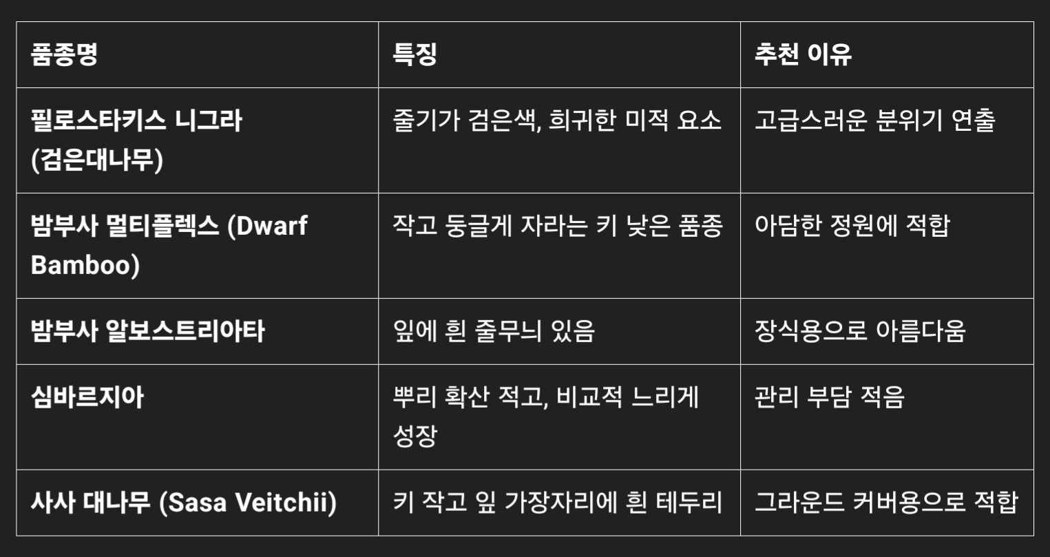→ 예: 필로스타키스 니그라(검은대나무), 밤부사 등.