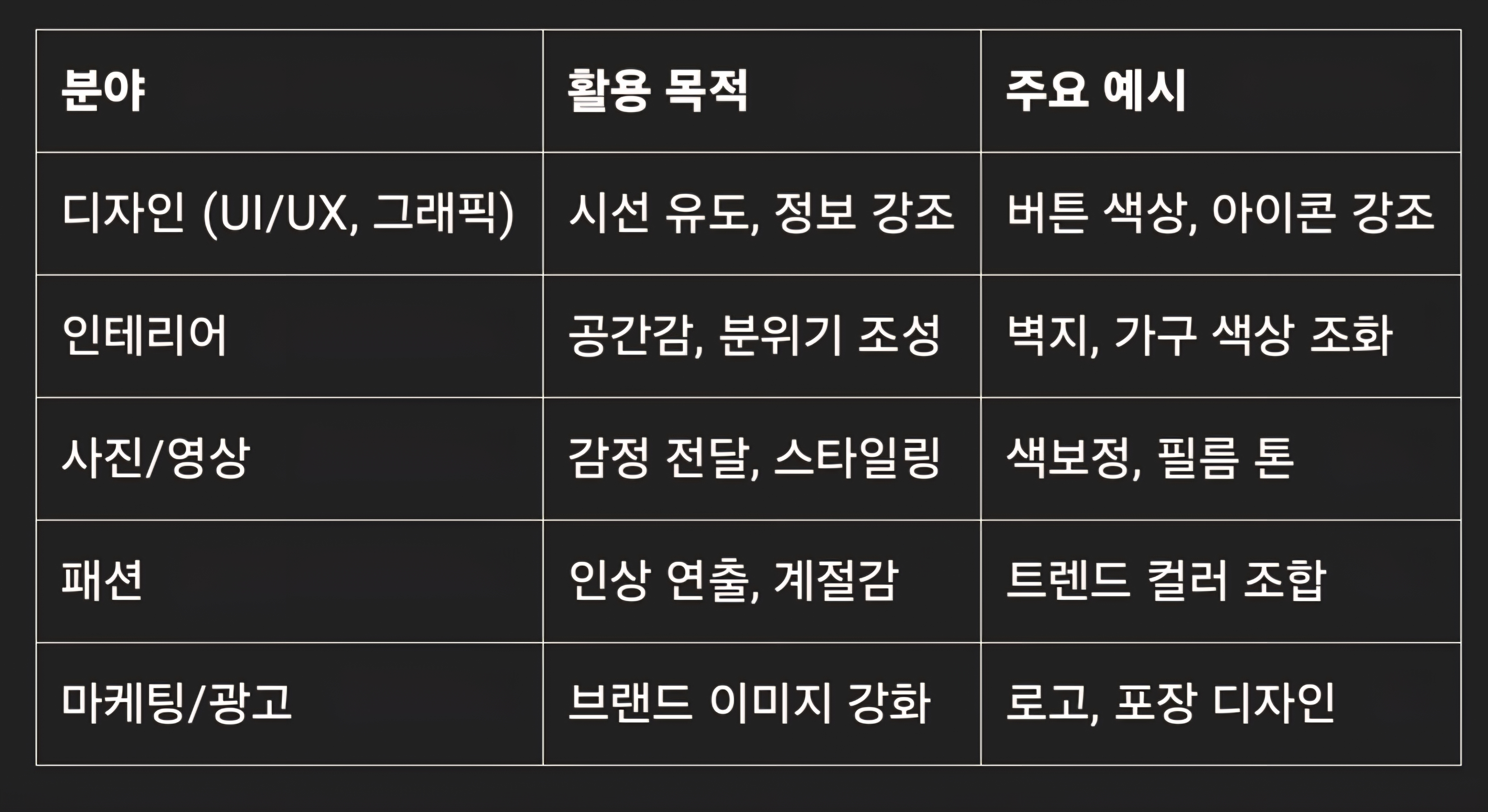 명도와 채도는 색의 성질을 구성하는 중요한 요소로, 단순히 "색을 보기 좋게 하는 기술"을 넘어 인간의 심리, 감정, 행동에까지 영향을 미치는 강력한 도구입니다. 이 두 요소를 이해하고 효과적으로 활용한다면, 보다 감각적인 디자인, 편안한 공간 구성, 효과적인 마케팅 전략 수립이 가능합니다. 명도와 채도는 우리가 무심코 보는 색 너머의 전략적 도구이며, 시각적 메시지를 더욱 풍부하고 세련되게 만들어주는 핵심 개념입니다.