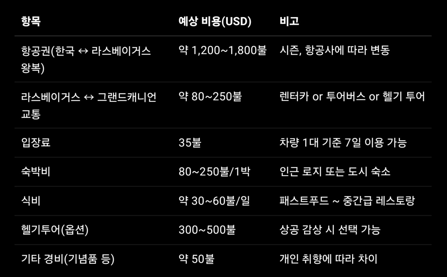 미국 서부를 대표하는 세계적인 관광 명소, **그랜드캐니언(Grand Canyon)**은 대자연이 만든 가장 장엄한 협곡 중 하나로, 미국을 방문하는 여행자라면 꼭 한 번 들러야 할 명소입니다. 아래는 그랜드캐니언 관광을 위한 여행 방법, 1인 경비, 준비물 등 전반적인 가이드를 자세히 안내드립니다.