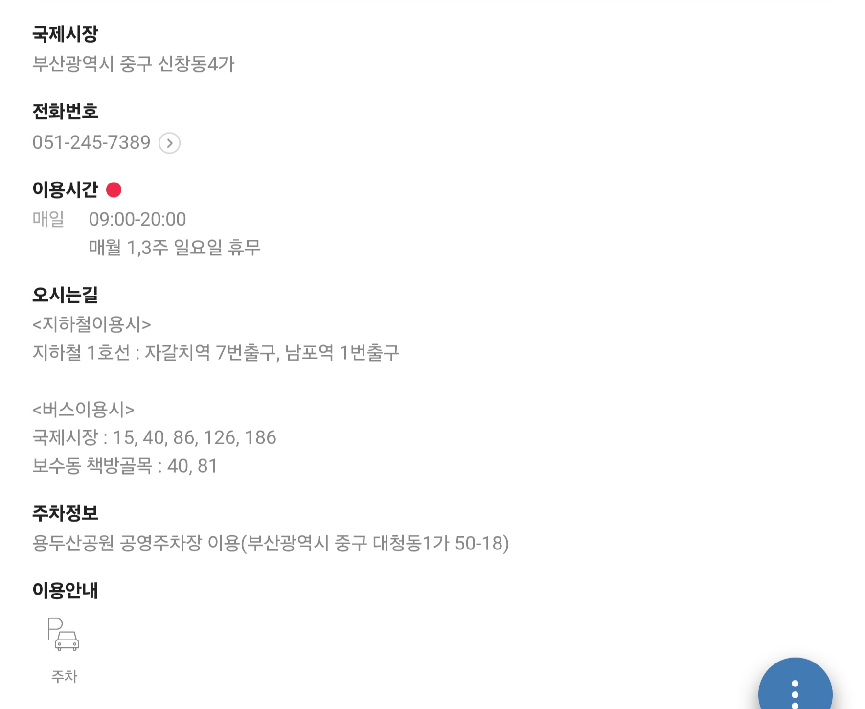 국제시장 자체에는 전용 주차장이 거의 없기 때문에 인근 공영주차장이나 민간 주차장을 이용해야 합니다.