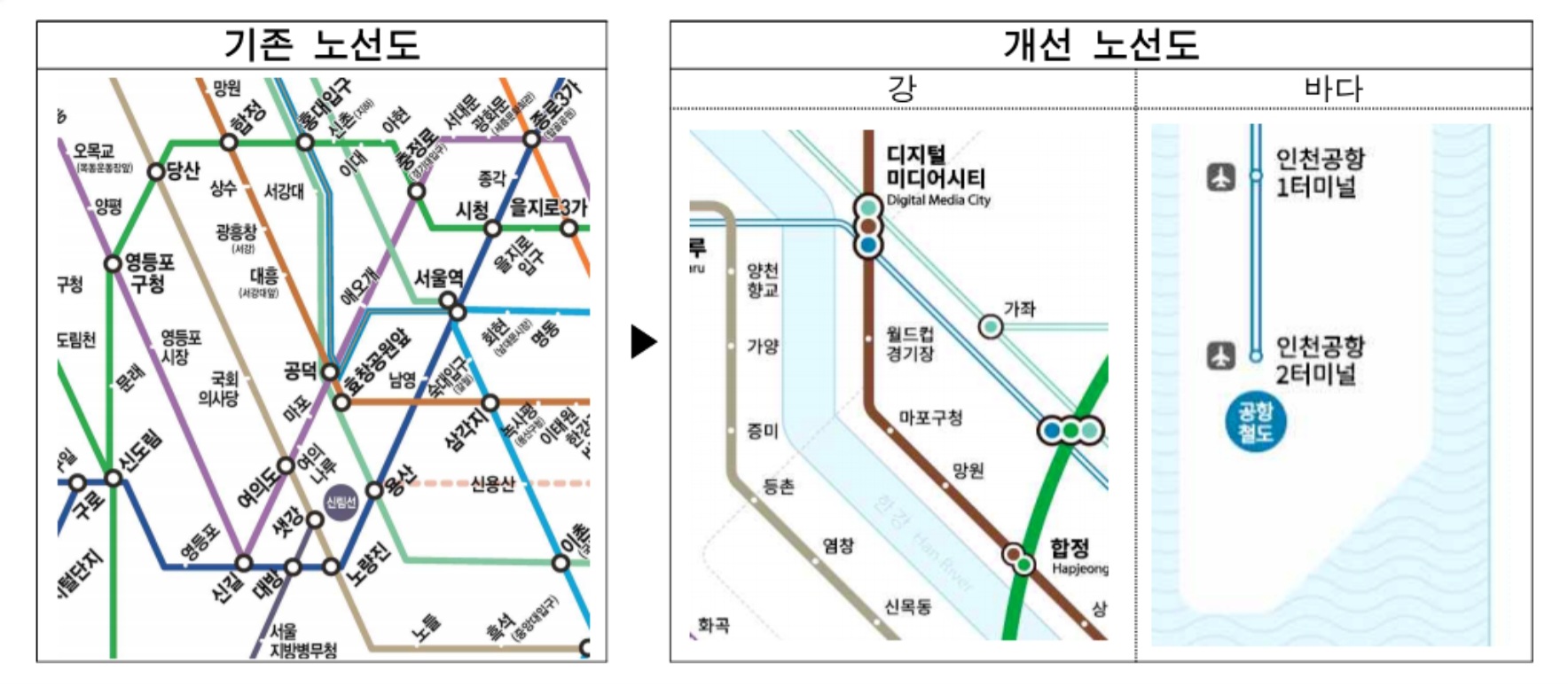 □ 또한 기존 노선도는 ▲위치를 알기 어려운 노선도 형태(각도가 다양한 다선형 형태) ▲일 반역과 잘 구분이 되지 않는 환승역 표기 ▲공항·강· 바다 등 지리적 위치에 대한 인지 부족 ▲역번호 표기 부재 등 이용객을 위한 배려가 부족했습니다.