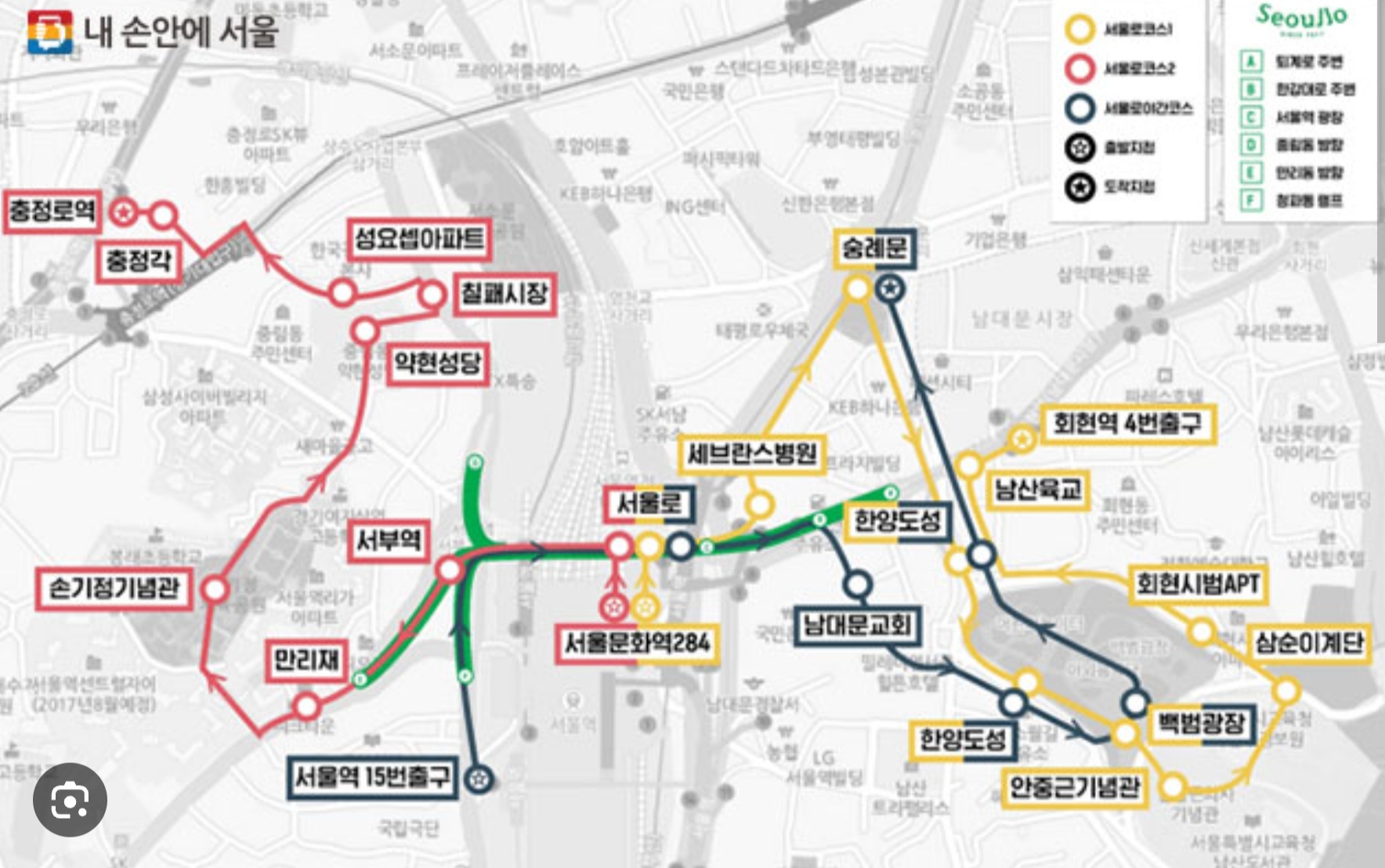 서울역광장 입구 → 서울로7017 본길 → 만리동광장 → 장미무대 → 회현역 연결로 → 남대문시장 구경 → 중림창고 카페에서 휴식