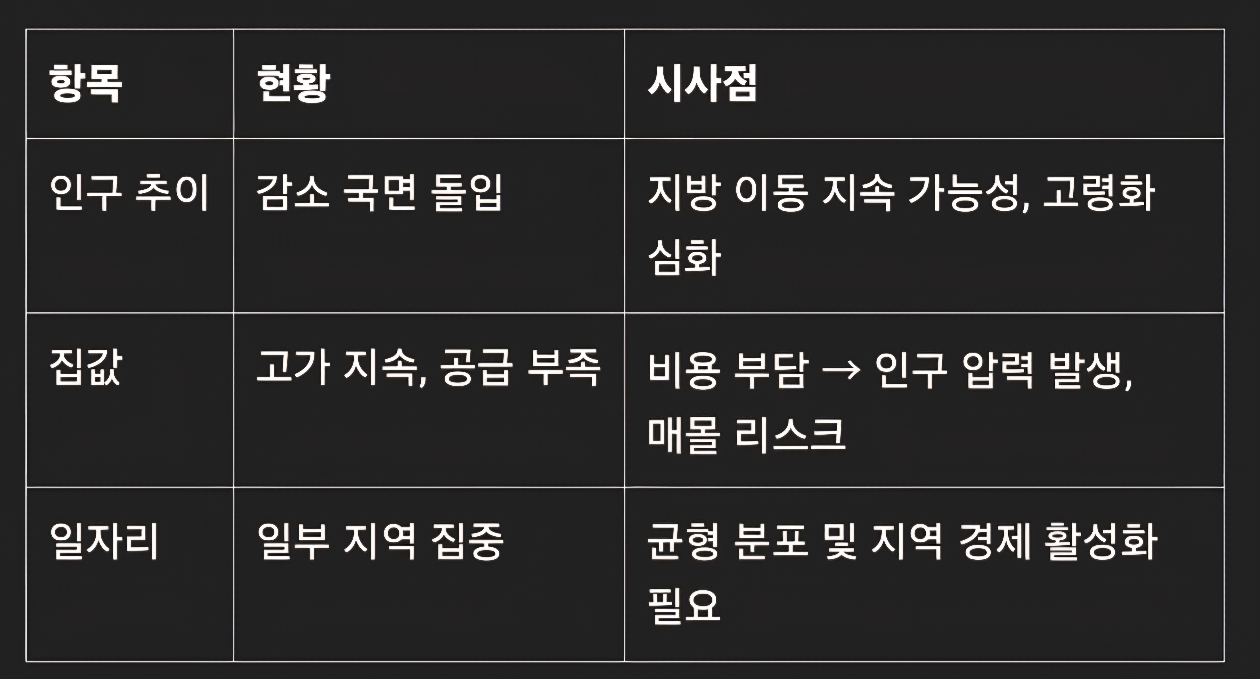 – 반면 도심 외곽 및 도농복합 지역은 일자리 기반이 약해 인구 감소와 연결되는 경향이 있습니다.