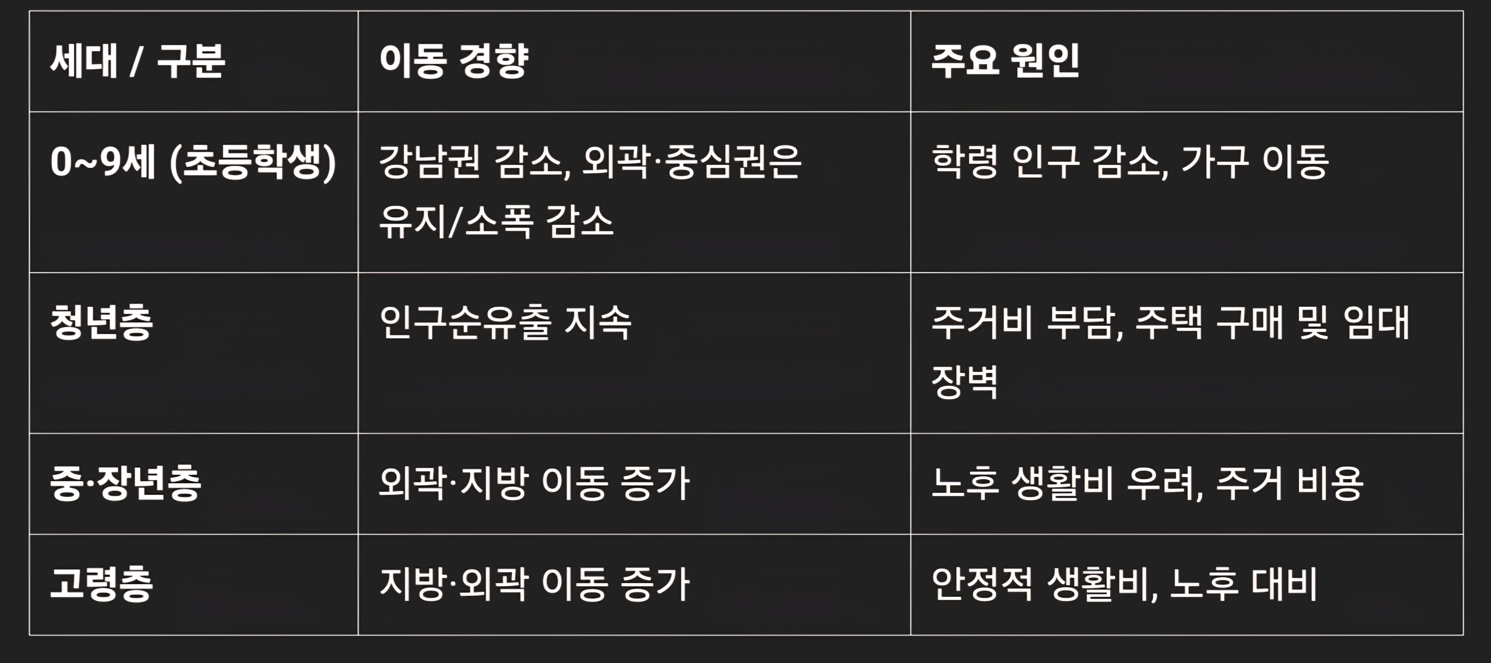 1. 저출산·가족형 가구는 서울 외곽으로 이동 중 → 도심 및 핵심 지역의 학령 인구 감소