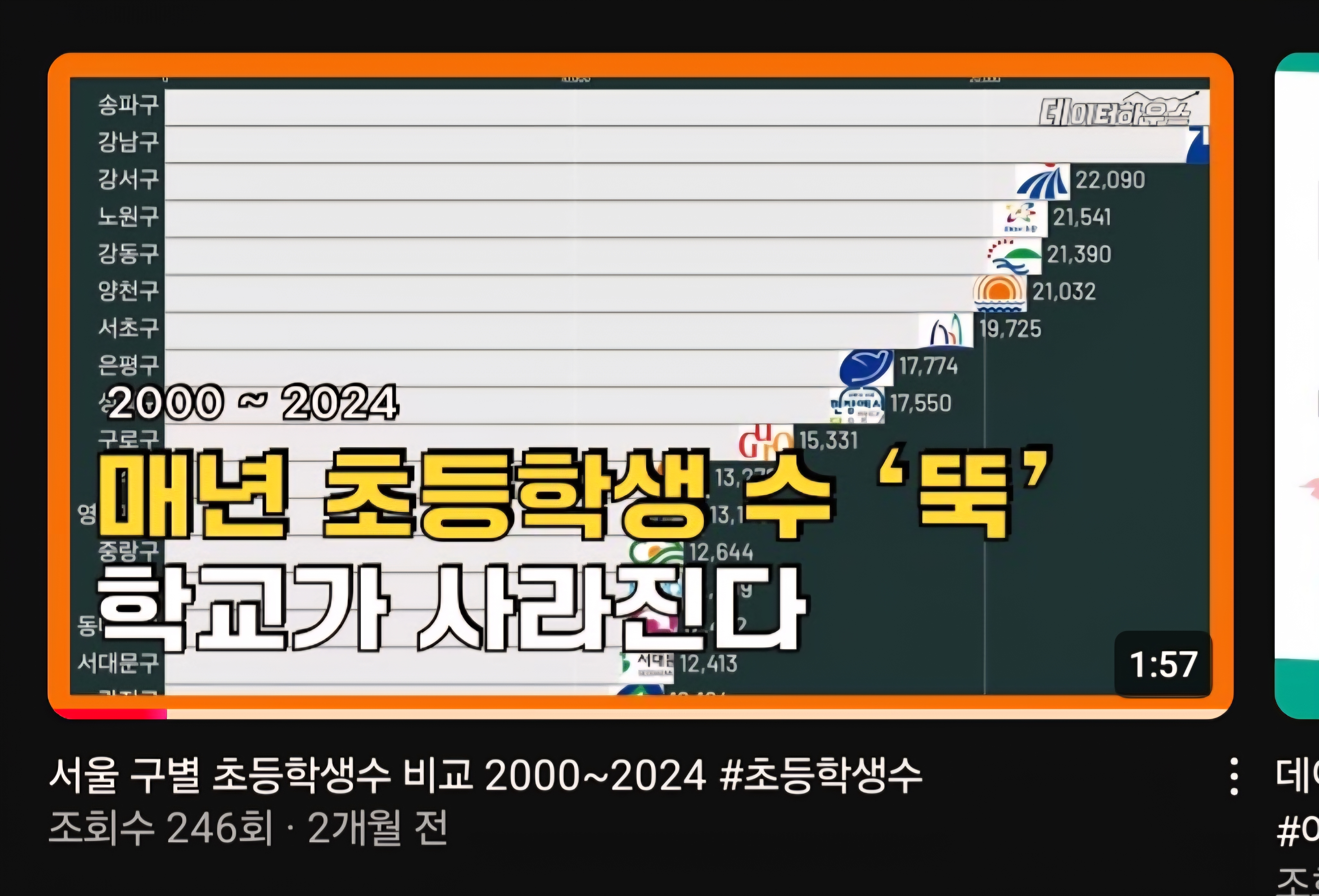 위 영상에 따르면 2000년~2024년 사이 일부 구(예: 강남·서초·송파)는 초등학생 수가 꾸준히 감소한 반면, 노원·도봉 등 외곽 구는 유지 또는 다소 증가한 경향이 있습니다 .