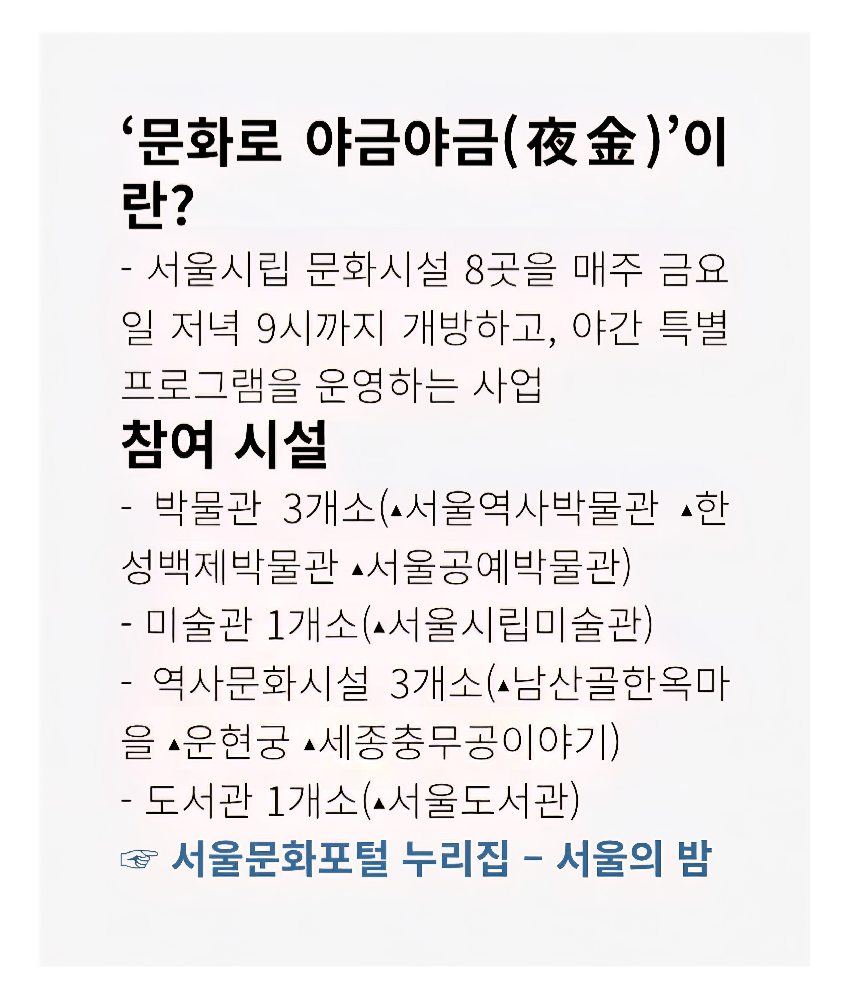 ‘문화로 야금야금’의 모든 행사는 무료로 진행되며, 더 많은 프로그램 정보는 서울문화포털 누리집(서울의 밤) 메뉴를 확인하면됩니다.