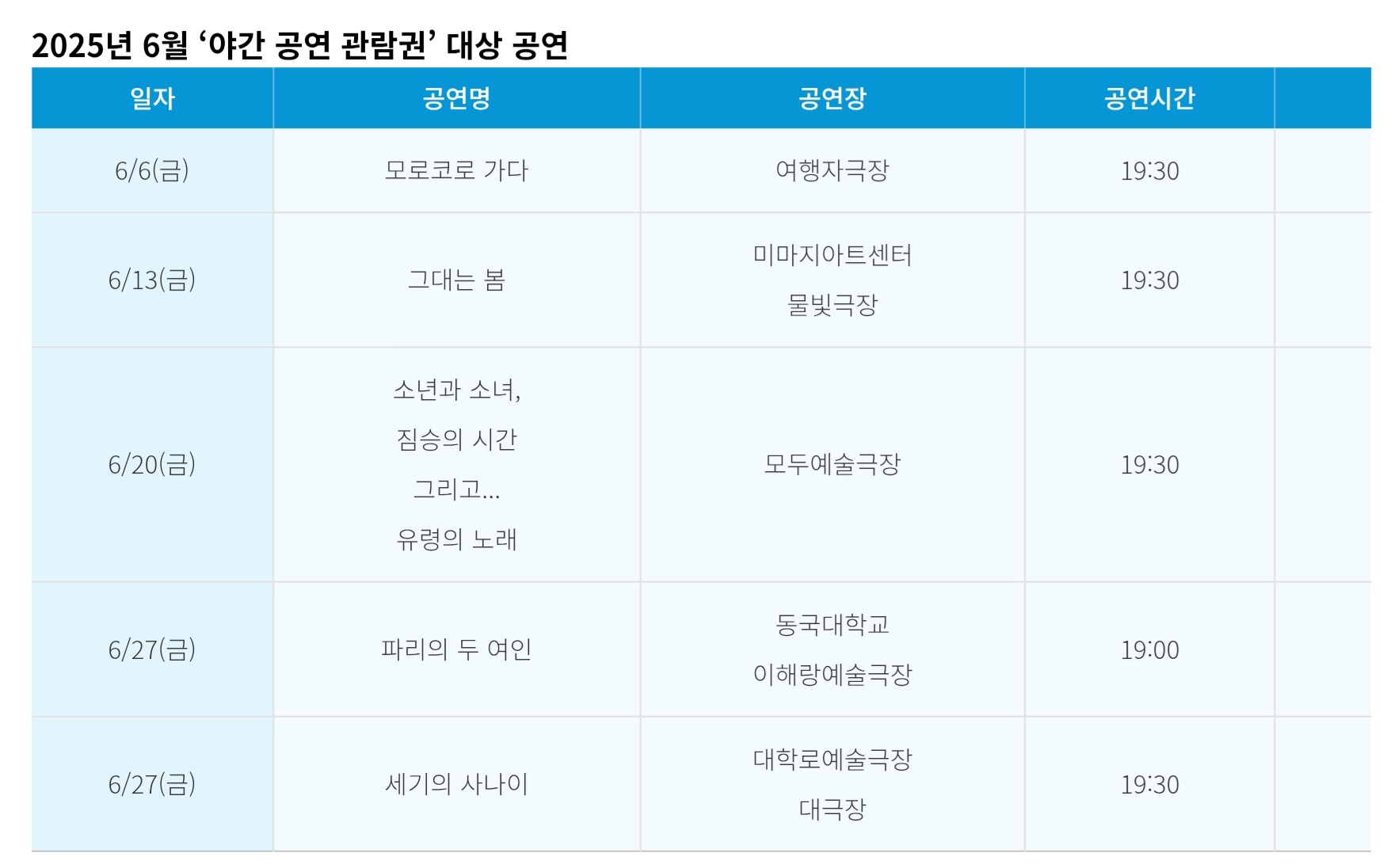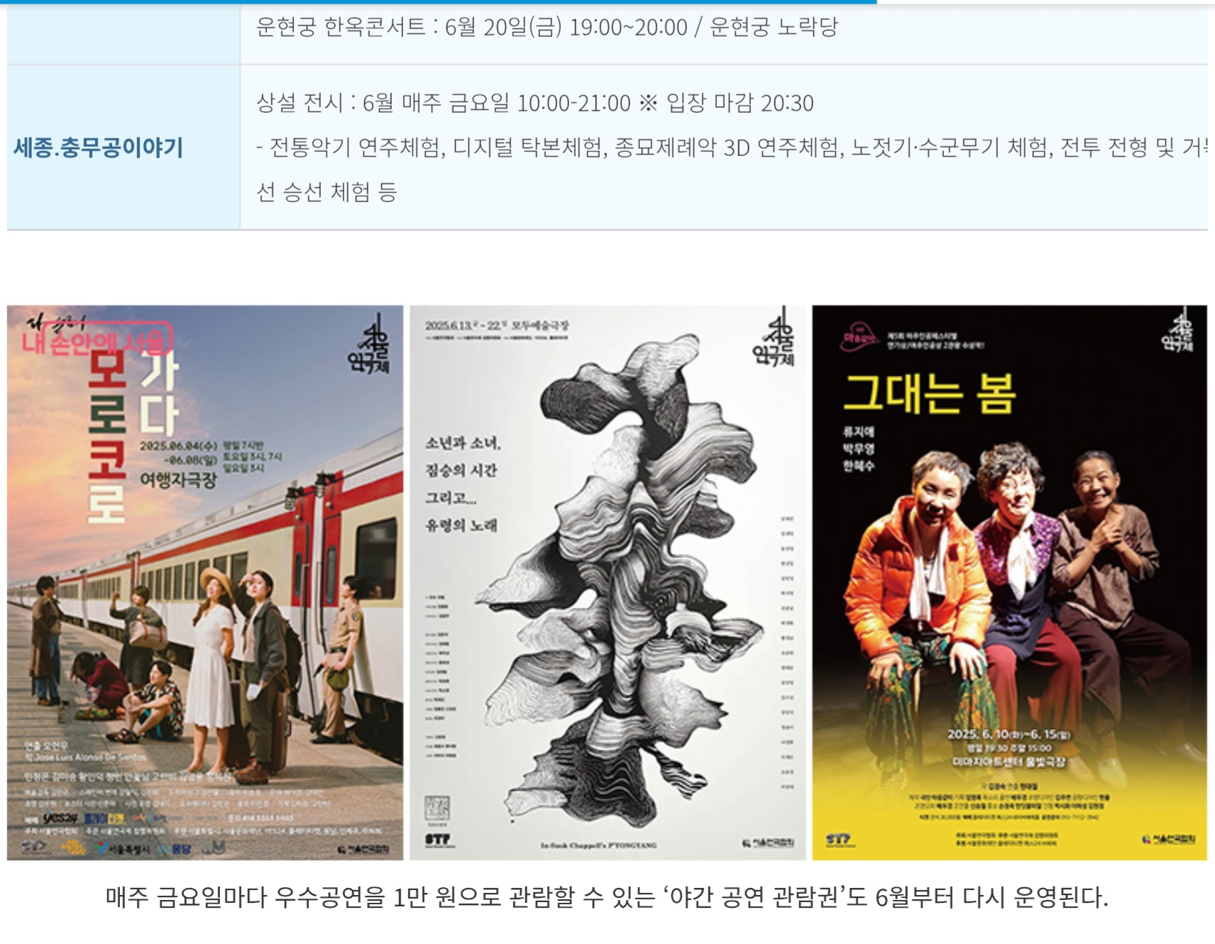 아울러, 작년 첫 해 운영에 모든 공연이 매진되며 큰 사랑을 받았던 ‘야간 공연 관람권’도 6월부터 다시 운영됩니다. ‘야간공연 관람권’은 ‘문화로 야금야금’과 연계해 정가 3~5만 원 상당의 공연을 1만 원에 관람할 수 있도록 마련된 프로그램입니다.