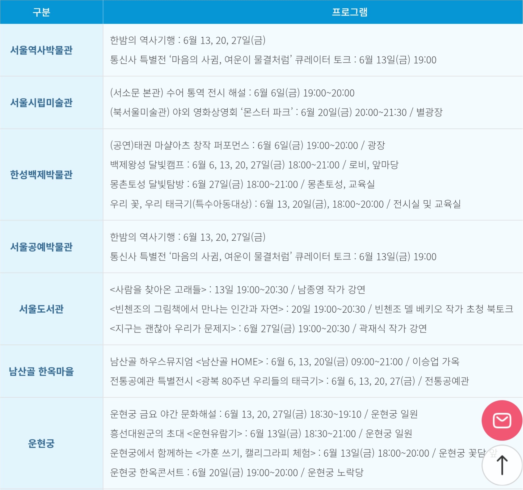 ▴서울백제어린이박물관의 ‘우리 꽃, 우리 태극기’(6.13, 20) ▴흥선대원군의 초대를 받아 왕족의 풍류를 즐긴다는 콘셉트인 운현궁의 ‘운현유람기(6.13) ▴서울시립 북서울미술관의 야외 영화상영회 ‘몬스터파크’(6.20) 등이 눈길을 끕니다.