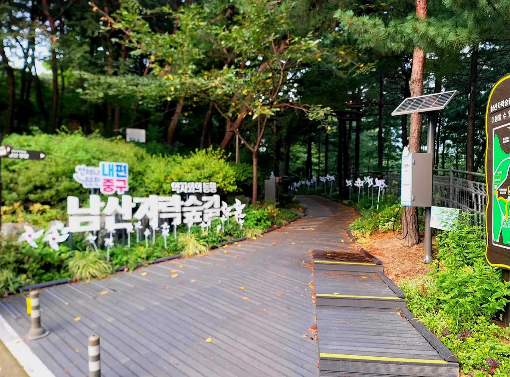 남산자락숲길은 중구 어디서나 15분이면 닿는 ‘일상 속 숲세권’으로, 무학봉근린공원에서 반얀트리까지 이어지는 총 5.14km 구간의 숲길입니다. 흙길과 데크길로 조성돼 유모차, 휠체어, 노약자, 임산부 누구나 편하게 걸을 수 있는 무장애 길로, 숲길 안에는 유아숲체험원, 황톳길, 전망대, 지그재그 데크길 등이 이어져 재미를 더합니다.