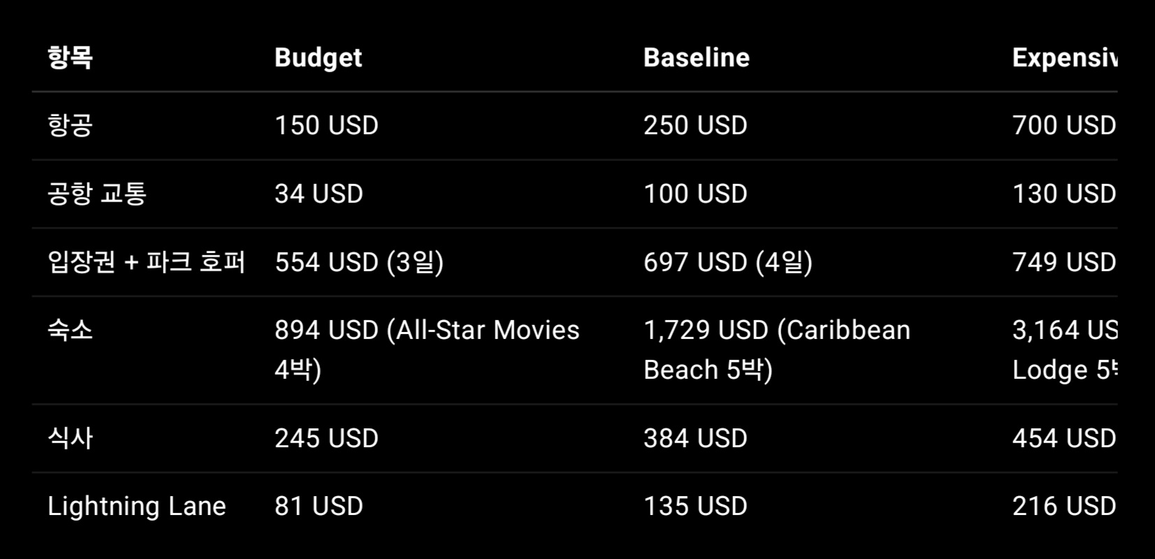 웹사이트 “Mouse Hacking”에 따르면, 2025년 기준으로 WDW 1인 기준 솔로 여행 예산은 아래와 같습니다 :
