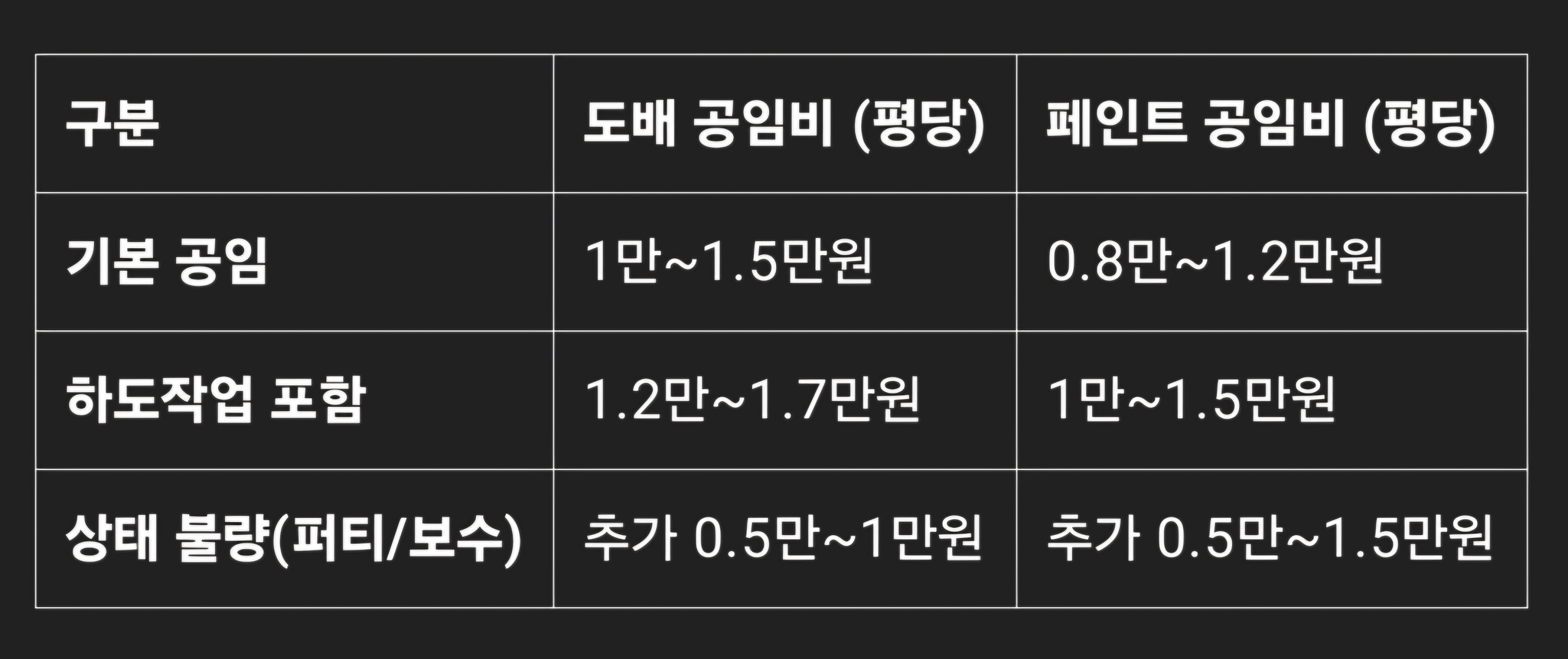 특히 곰팡이 제거나 방수용 특수페인트 시공은 평당 1.5만원 이상 나올 수 있습니다.