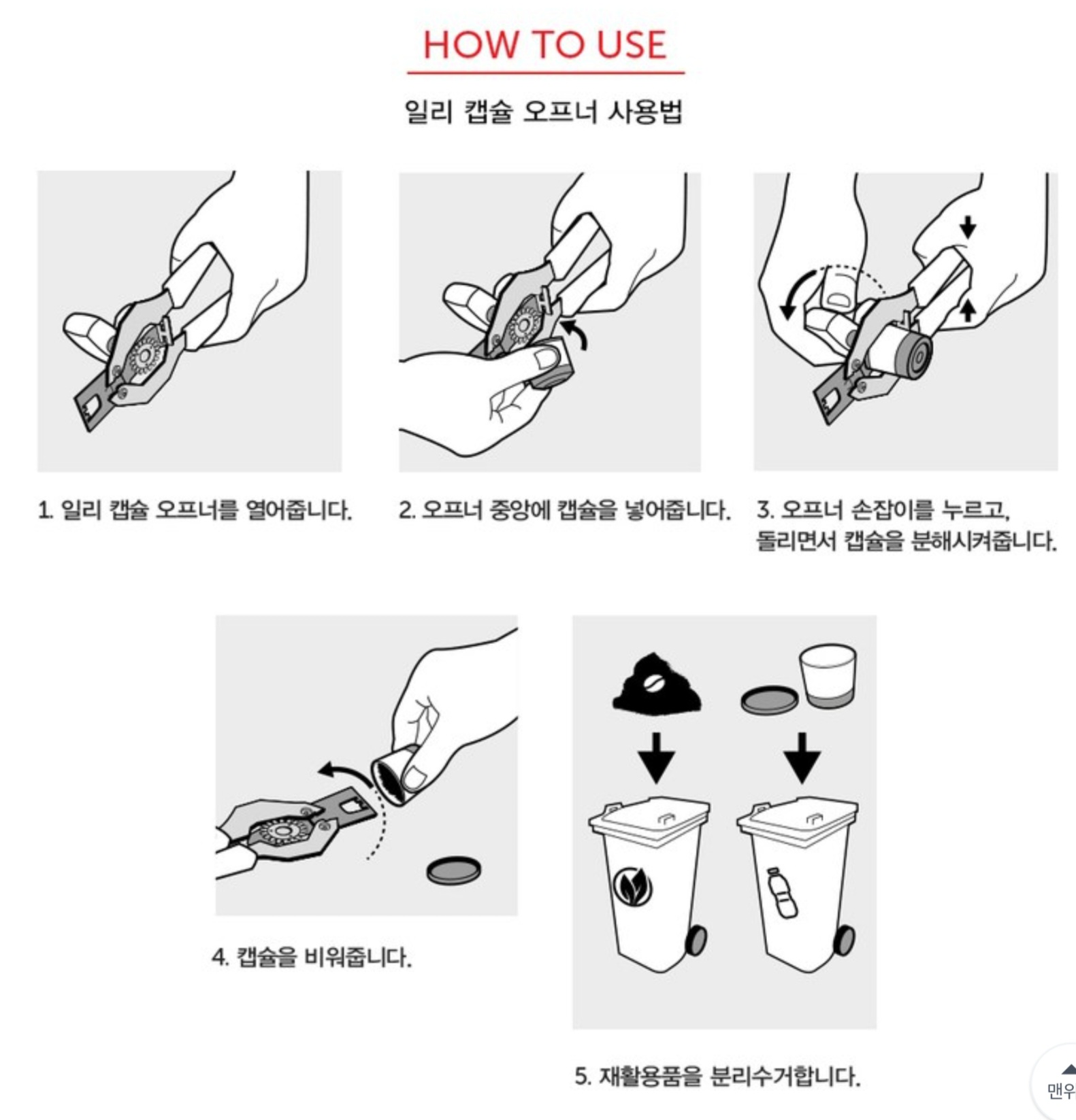 플라스틱/알루미늄은 분리 배출 → 커피 찌꺼기는 냉장고 탈취제나 하수구 청소용 등으로 개인 재사용 .
