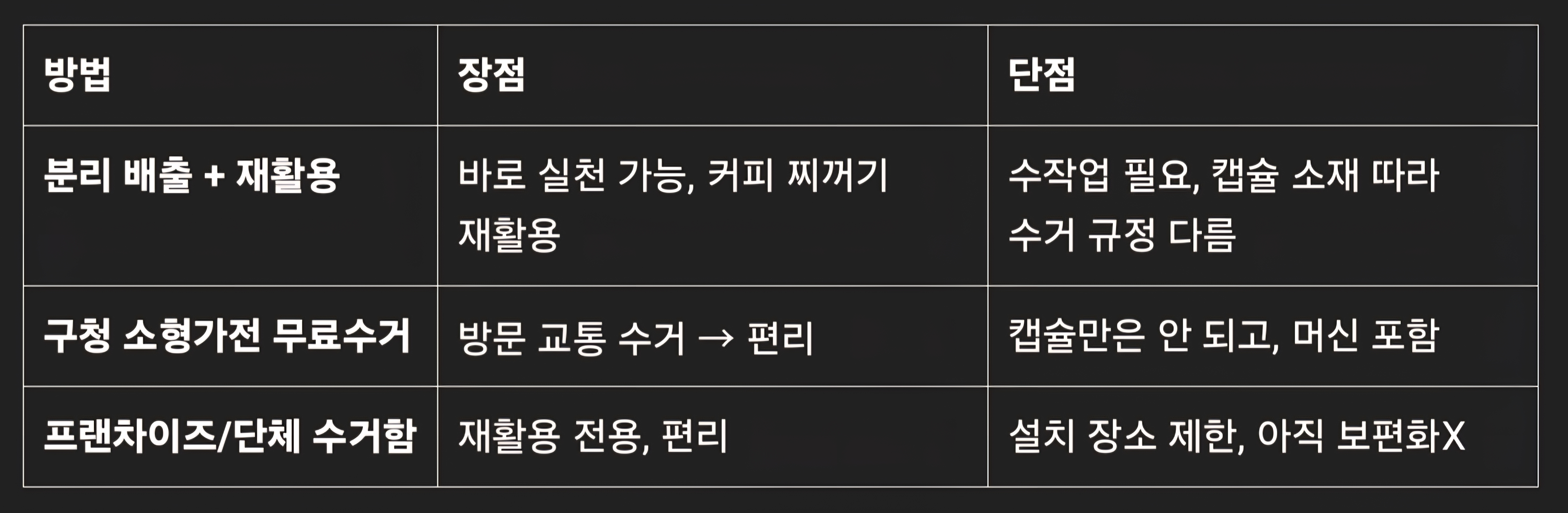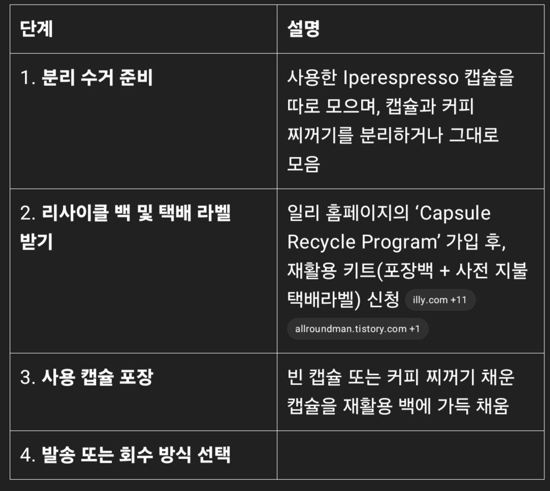 제휴 수거함: 일부 지역 매장에서 별도 수거함을 통해 회수 | | 5. 재활용 처리 | 수거된 플라스틱 캡슐은 재료로 재생되고, 커피 찌꺼기는 퇴비나 에너지 자원 등으로 전환 |