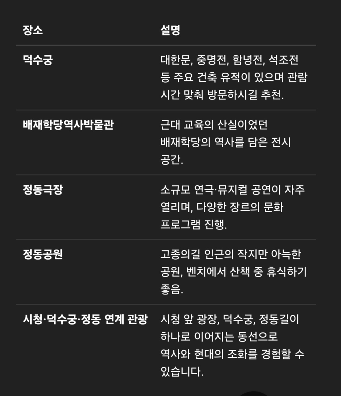 덕수궁, 시청, 정동극장, 배재학당까지 연결되며 하루 일정으로도 충분한 코스입니다.