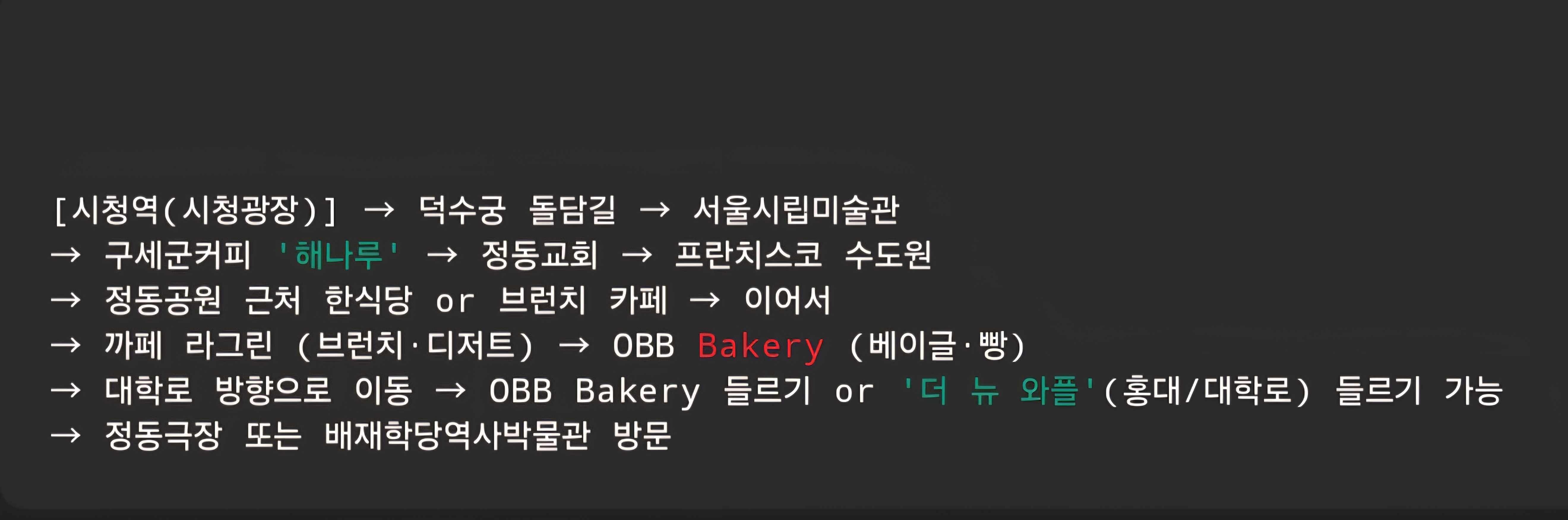 1. 출발지: 시청역 2번 출구 → 시청 광장 → 덕수궁 돌담길 입구.