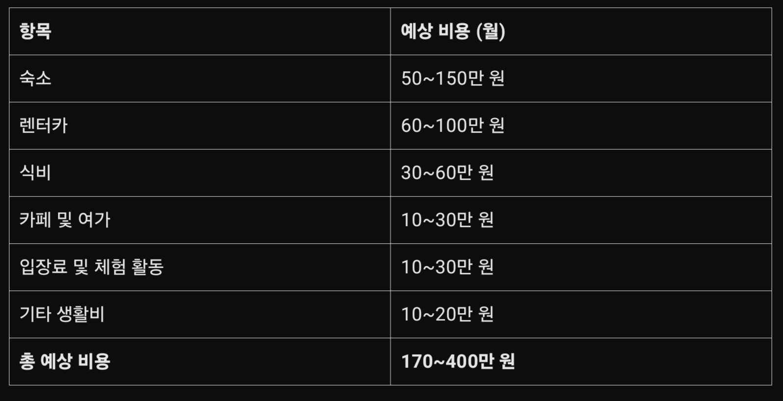 한 달 동안 제주도에서 생활하는 데 드는 예상 비용을 정리하면 다음과 같다.