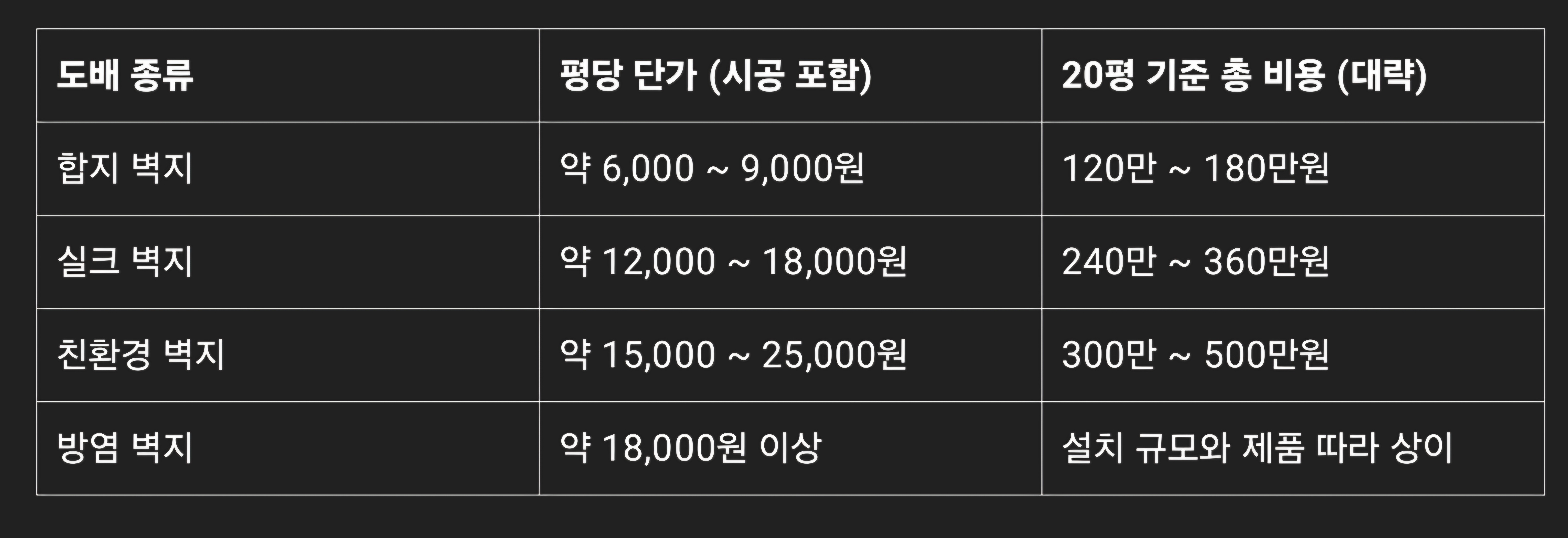 2. 도배 시공 비용 (2024년 기준, 평당 단가)