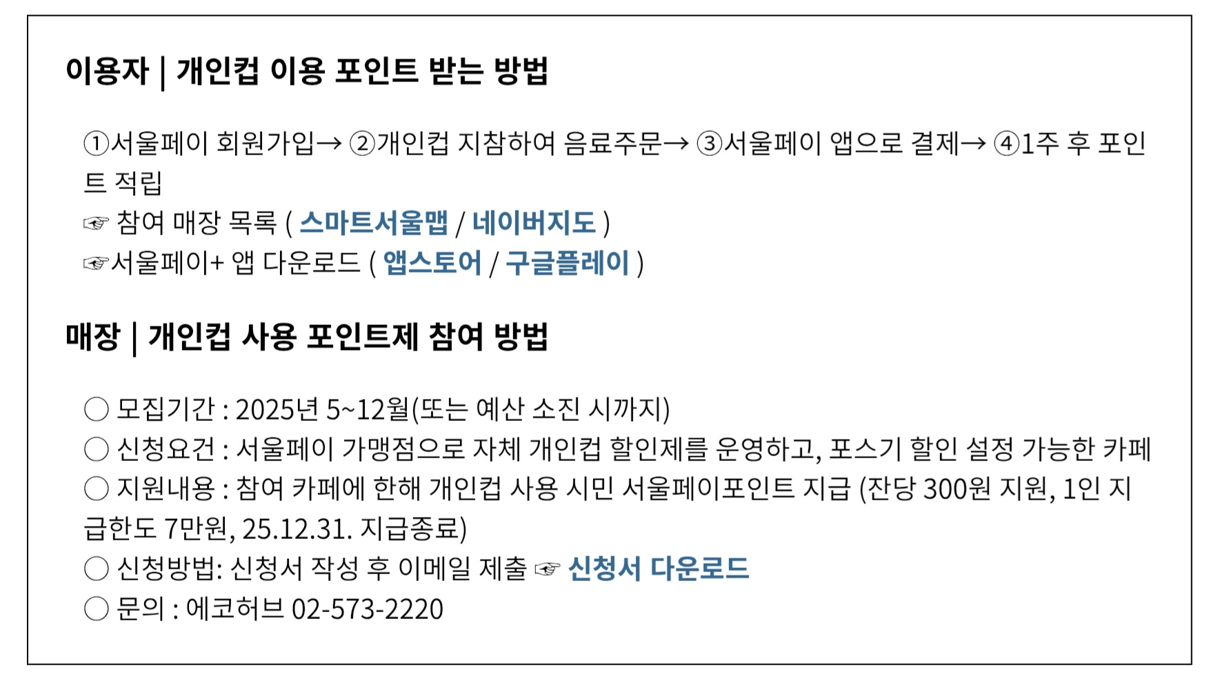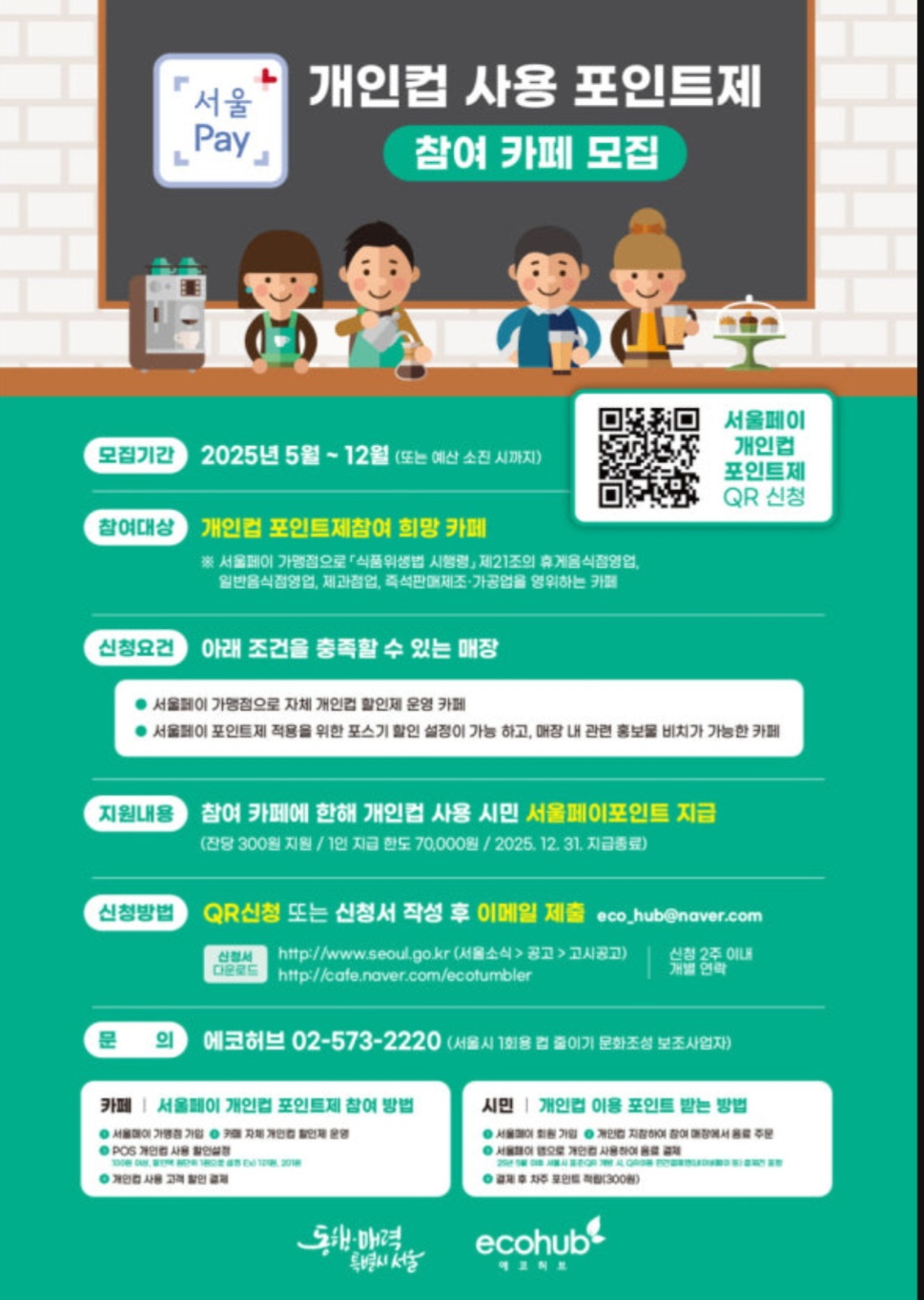 ‘서울페이 개인 컵 포인트제’ 참여를 원하는 매장은 공고문과 포스터에 기재된 QR코드를 통해 사업자등록증을 포함한 신청서를 제출하거나, 서울시 보조사업자의 전자우편(eco_hub@naver.com)으로 공고문의 신청서와 사업자등록증을 제출하면 됩니다. 공고문은 서울시 누리집과 서울시 보조사업자 온라인 카페에서 확인할 수 있습니다.