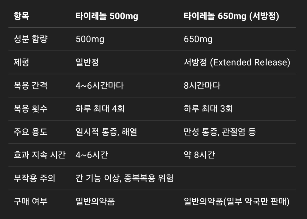 타이레놀 650mg은 1정당 아세트아미노펜 650mg이 들어 있으며, ‘서방형(徐放形)’ 제제입니다. 서방형이란 약물이 체내에서 천천히 흡수되어 더 오랜 시간 동안 효과가 지속되도록 설계된 제형입니다. 주로 만성적인 통증(예: 관절염 등)에 사용되며, ‘타이레놀 ER’, ‘타이레놀 서방정’으로 알려져 있습니다.