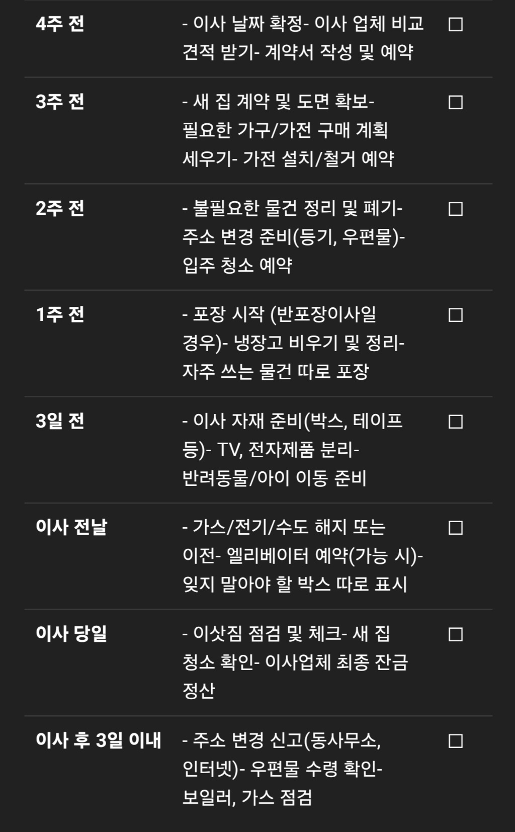 📋 이사 체크리스트 (4주 전부터 이사 당일까지)