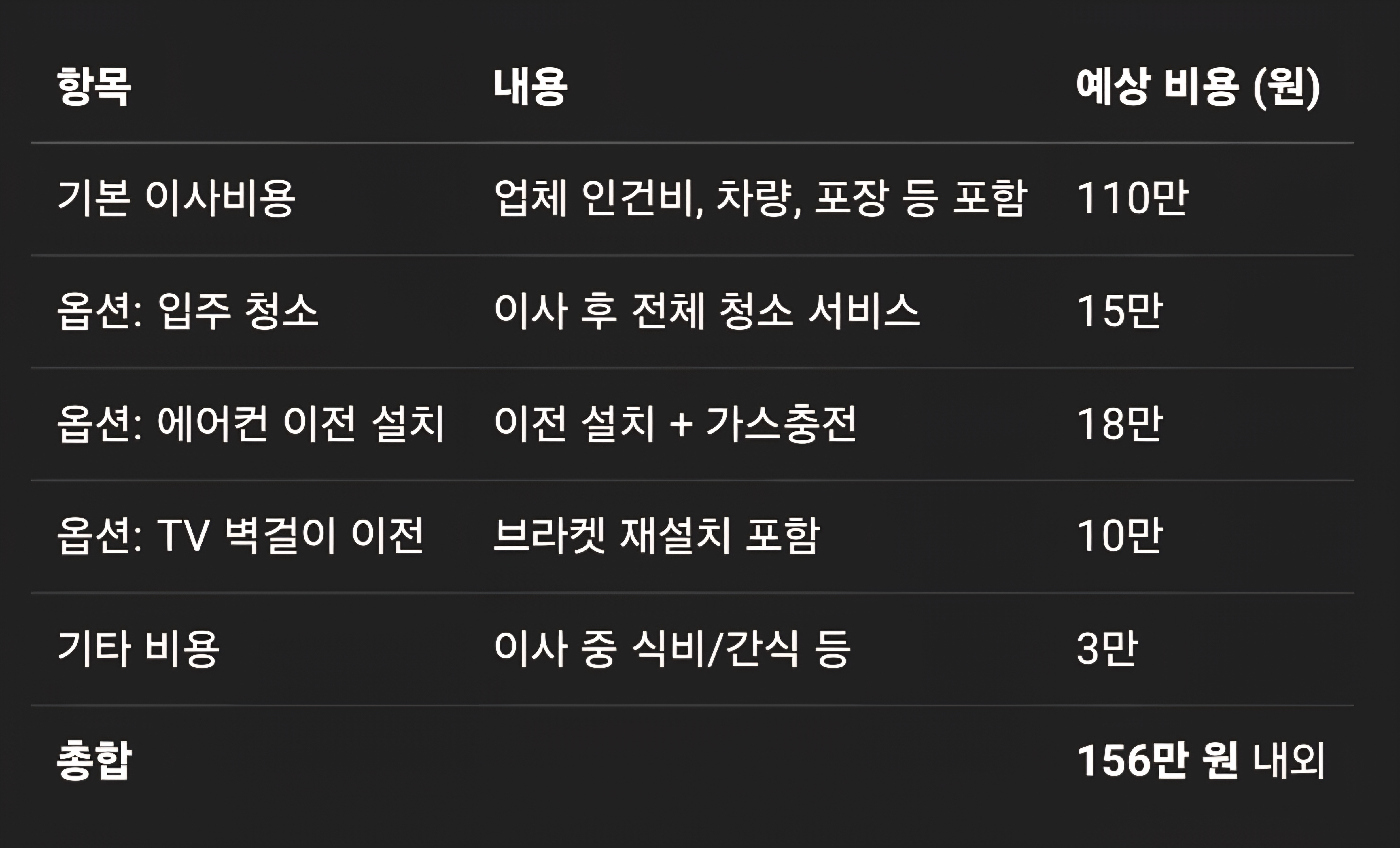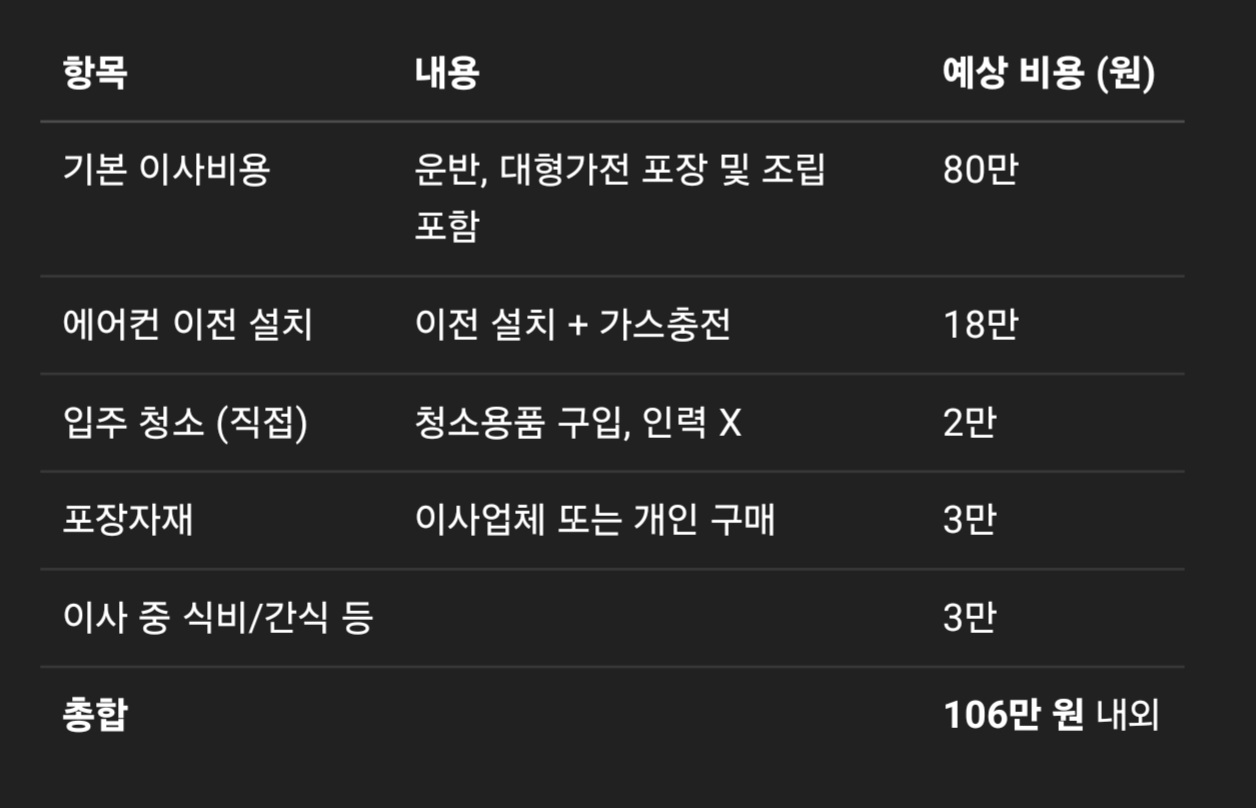 📍 주의: 대형 냉장고, 건조기 등 추가 운반이 필요한 고가전이 있을 경우 +10~20만 원 추가될 수 있음.