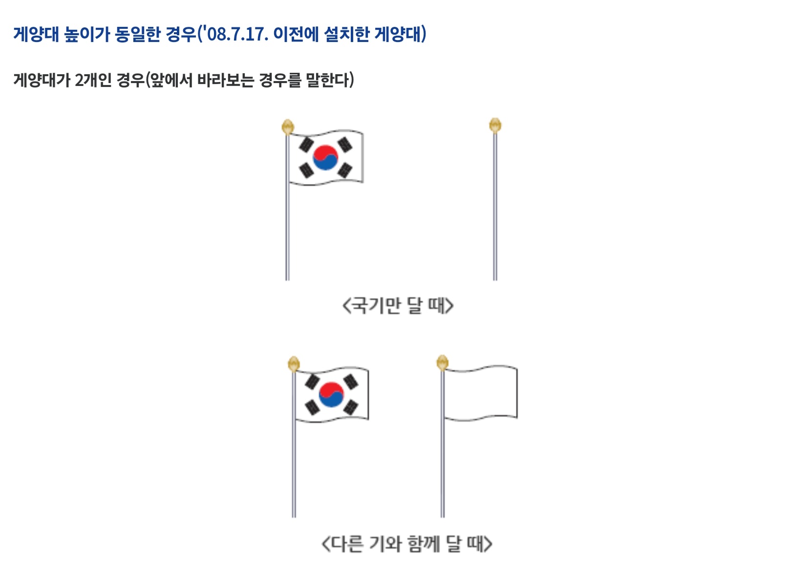 게양할 때는 깃대 맨 꼭대기까지 태극기를 올린 뒤, 다시 아래로 내려 조기의 위치에 고정합니다.