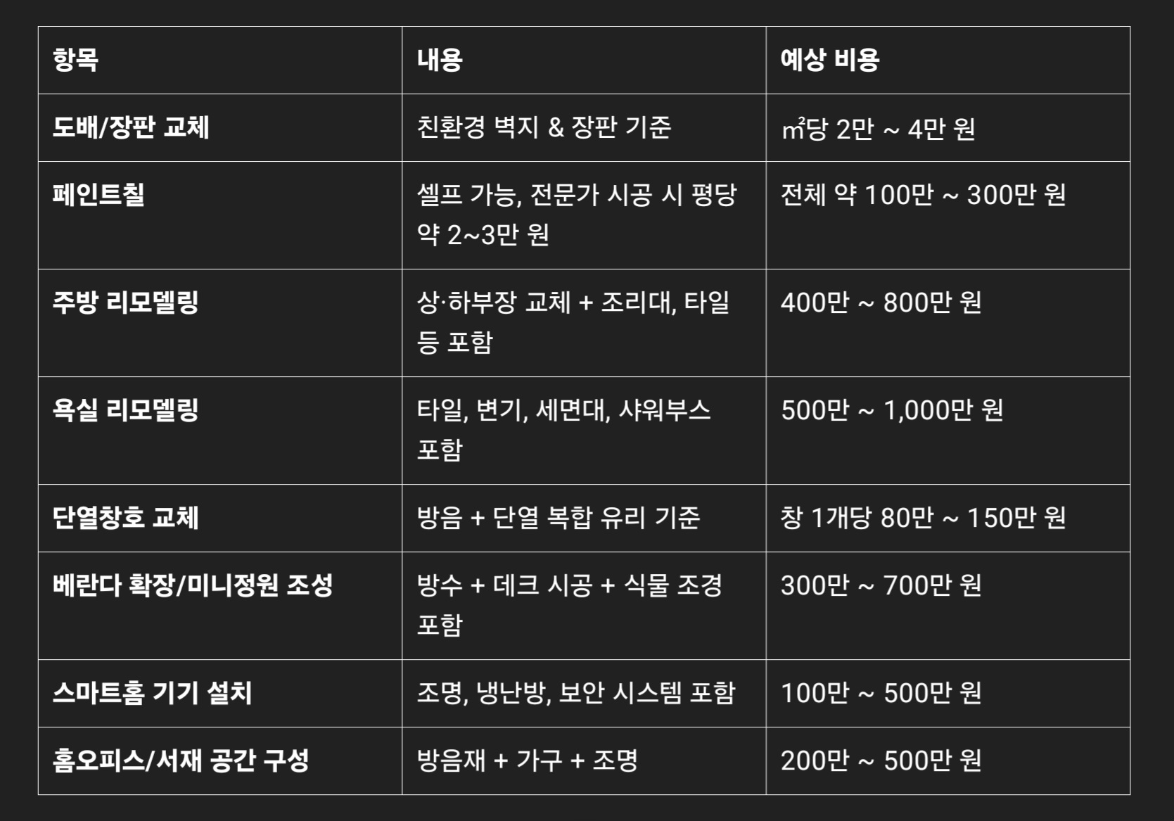 각 가정의 집 크기, 노후 상태, 지역에 따라 차이가 있으나, 평균적인 비용 범위는 아래와 같습니다.