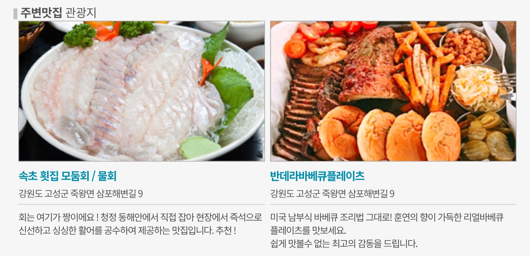 또한 화진포해변과 성분이 같은 백사장이 펼쳐져 있는 곳으로 수심이 낮고 백사장 전면으로 주위의 경관이 수려하여 수십만명의 관광객들의 사랑을 한몸에 받고 있는 곳이기도 합니다.