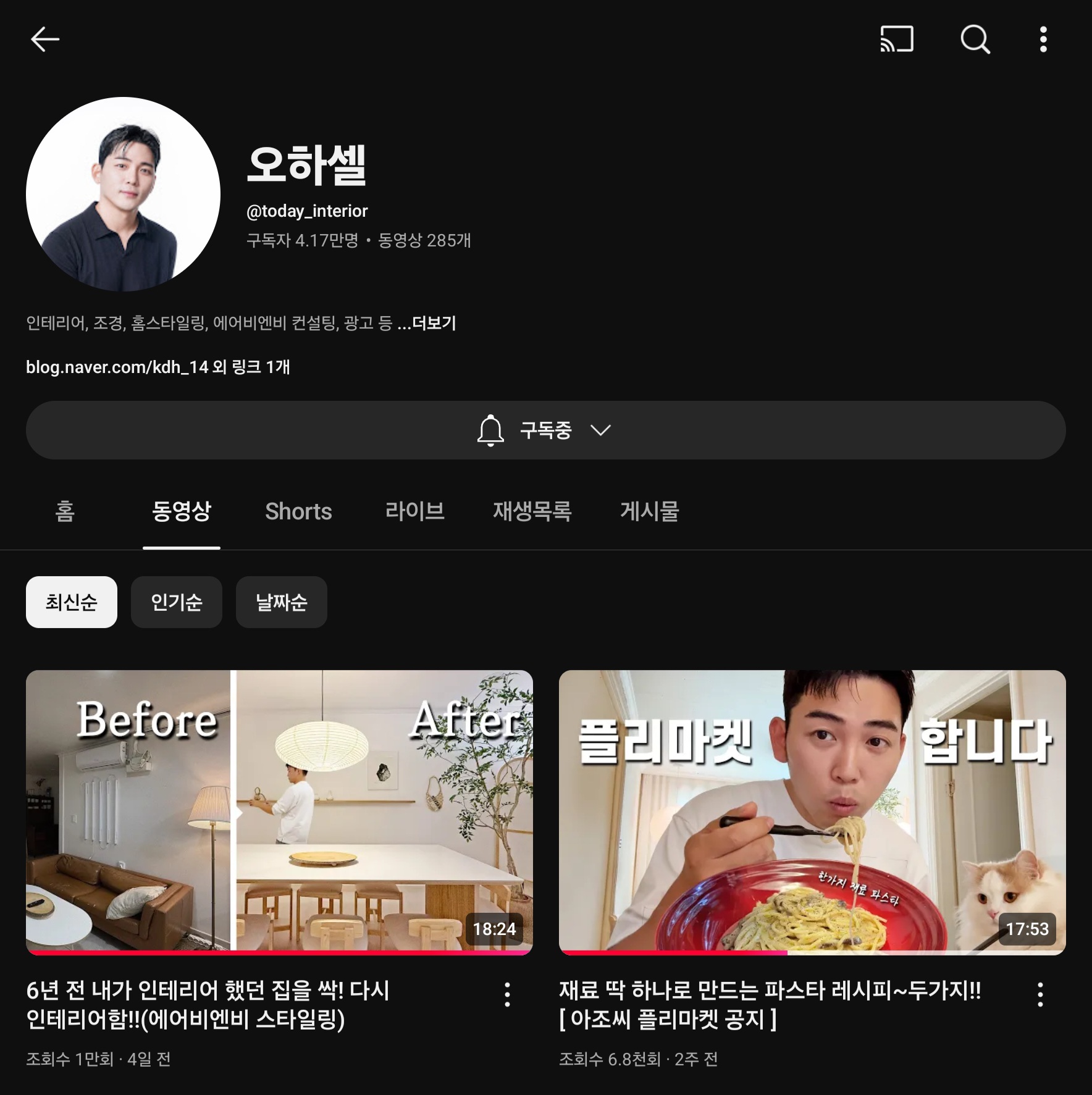유튜브 채널 @today_interior은 '오하셀(오늘 하는 셀프 인테리어)'이라는 이름으로 활동하는 인테리어 및 라이프스타일 콘텐츠 크리에이터 강동혁님의 채널입니다. 이 채널은 실내 인테리어 팁, 공간 활용 아이디어, 홈 스타일링 노하우 등 집 꾸미기에 관심 있는 분들을 위한 다양한 콘텐츠를 제공합니다.