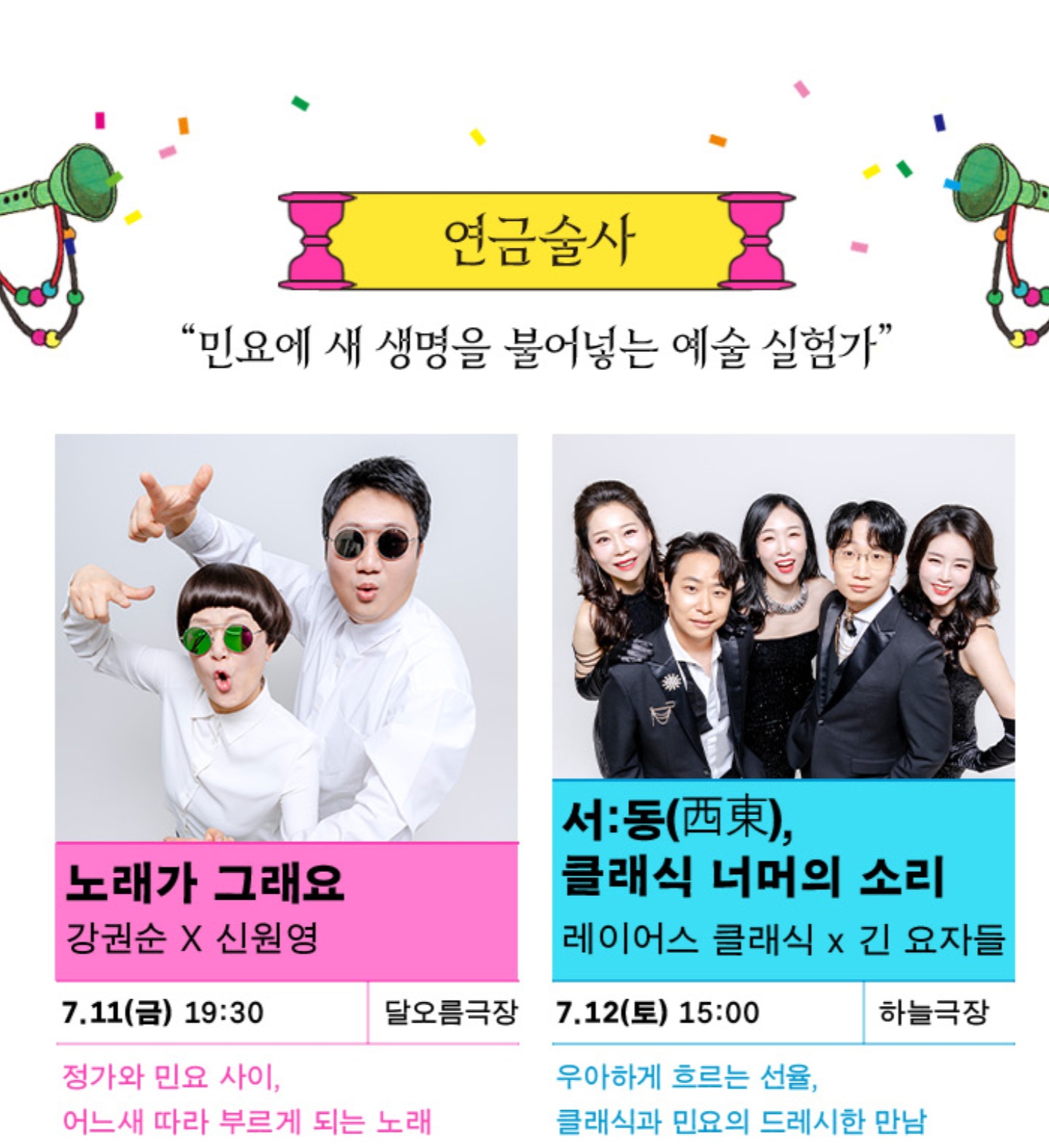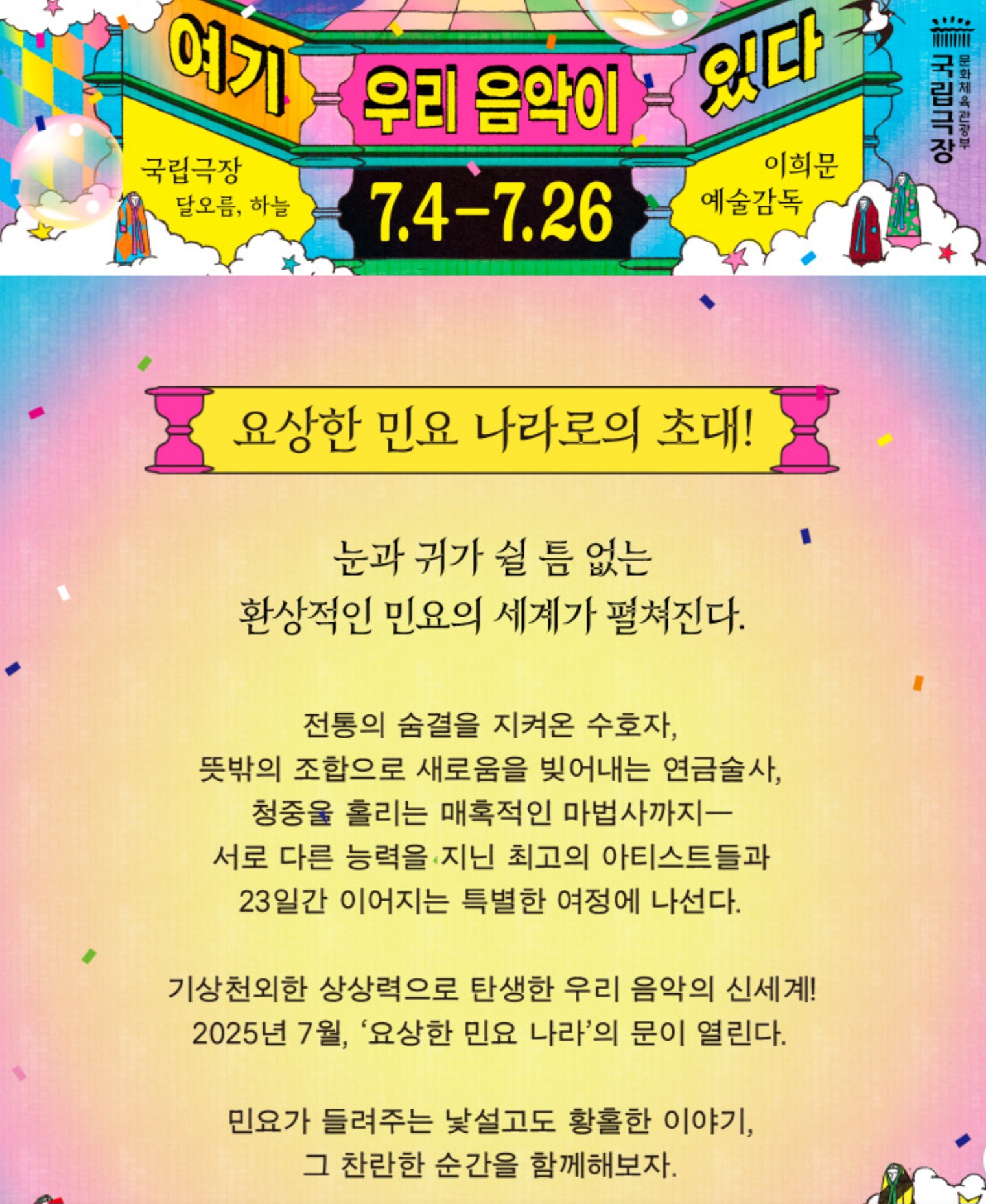 2025년 국립극장 여우락 페스티벌은 전통과 현대가 어우러진 우리 음악의 진수를 선보이는 대표적인 여름 음악 축제입니다.  '여기 우리 음악이 있다'는 의미를 담은 '여우락'은 국악의 대중화와 현대화를 목표로 다양한 장르와의 협업을 통해 새로운 음악적 시도를 이어오고 있습니다.  2025년에는 '민요의 재발견'을 주제로, 전통 민요의 현대적 재해석을 통해 관객들에게 새로운 감동을 선사할 예정입니다.