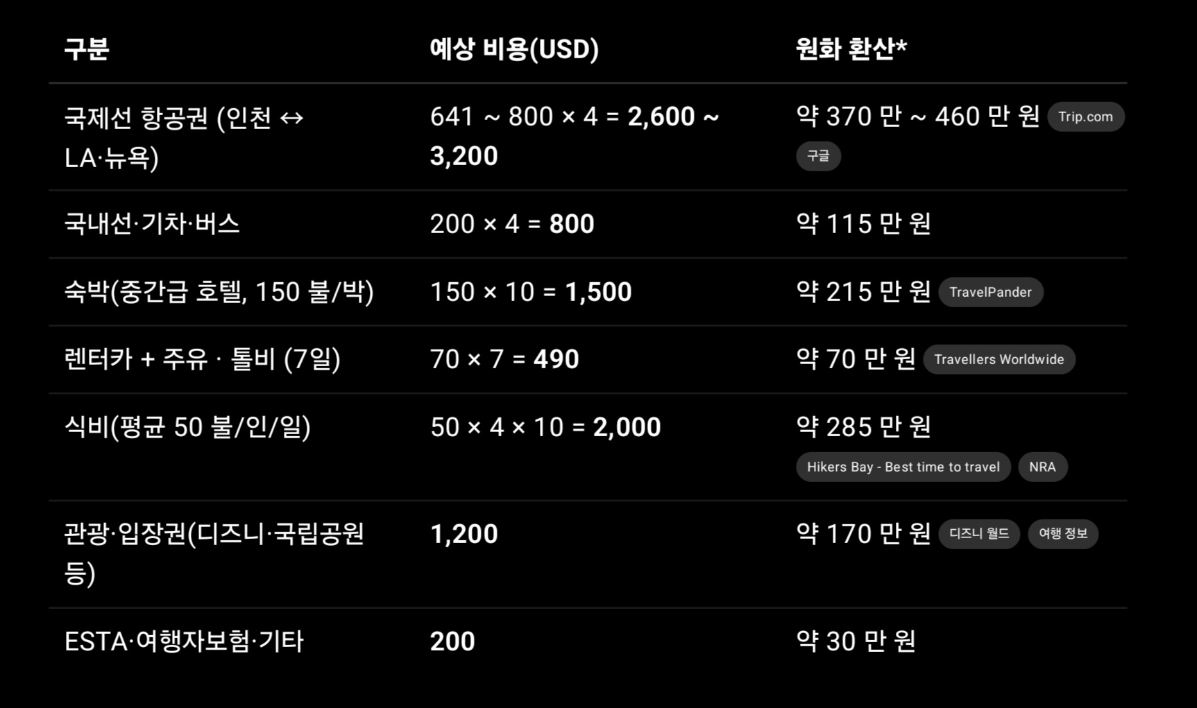 아래 글은 4인 가족(성인 2 + 어린이 2)을 기준으로, 왕복 항공‧숙소 10박 12일 일정을 모델로 삼아 대략적인 경비와 미국에서 가족 단위로 꼭 가봐야 할 명소를 한눈에 볼 수 있도록 정리한 가이드입니다.