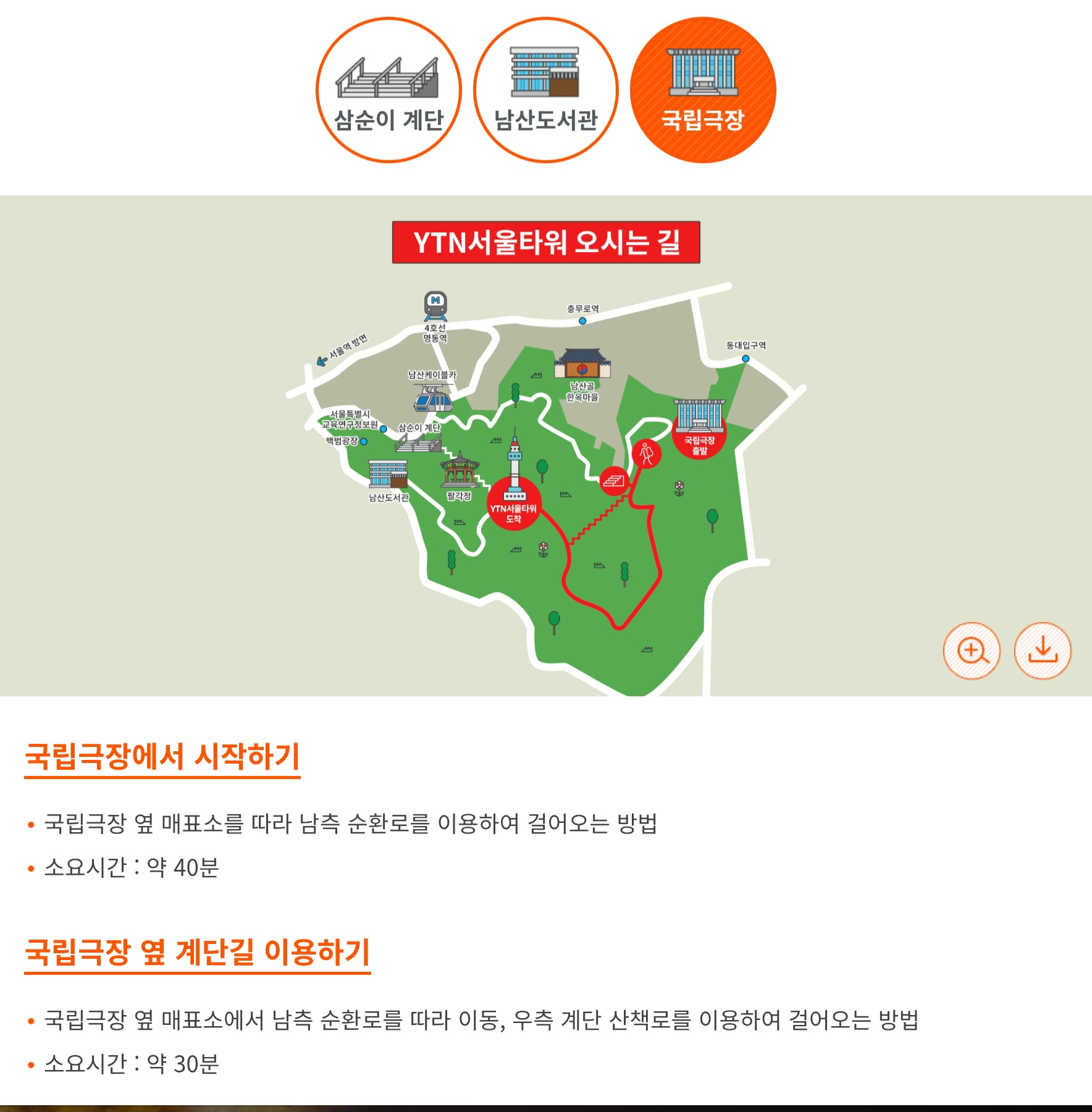 남산공원 내에는 다양한 등산로가 마련되어 있어, 도보로 YTN서울타워에 접근할 수 있습니다. 특히, 남산 둘레길은 자연을 즐기며 산책하기에 적합한 코스입니다.