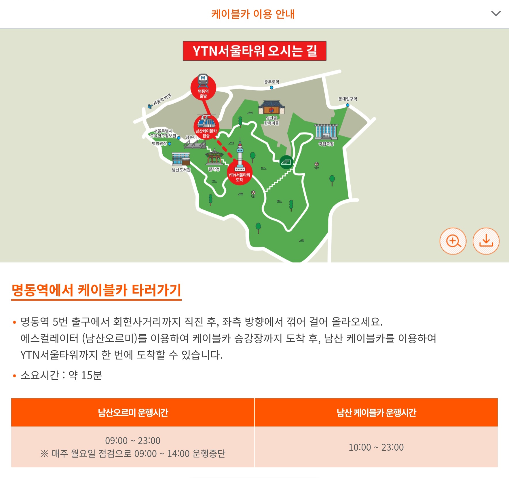 이용 방법: 지하철 4호선 명동역 3번 출구에서 도보로 약 10분 거리의 남산케이블카 승강장에서 탑승